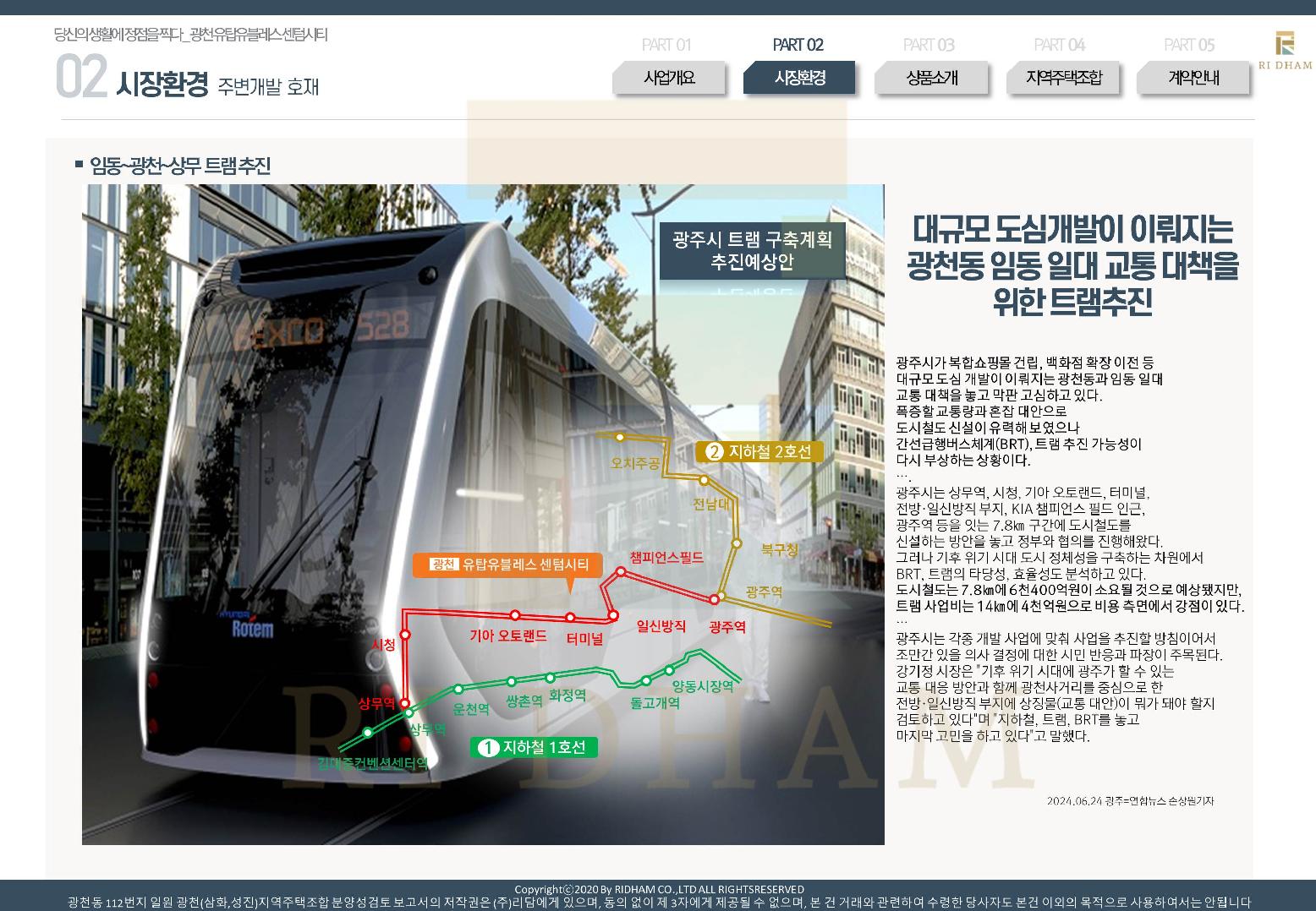 이 주거시설은 일반상업지역이라는 최상의 토지활용가치를 보여주는 입지에 터잡고 있으며 광역교통망 구축과 학군, 교통인프라가 우수한 곳입니다. 교통환경은 터미널 인근 위치이기에 시내외 진출이 편리하며, 무진로와 운암나들목 인근에 자리하여 광역교통의 편리함도 지녔습니다. 더 나아가 상무~광천을 잇는 트램 예정으로 더욱 편리한 역내 교통망이 갖춰질 것입니다.