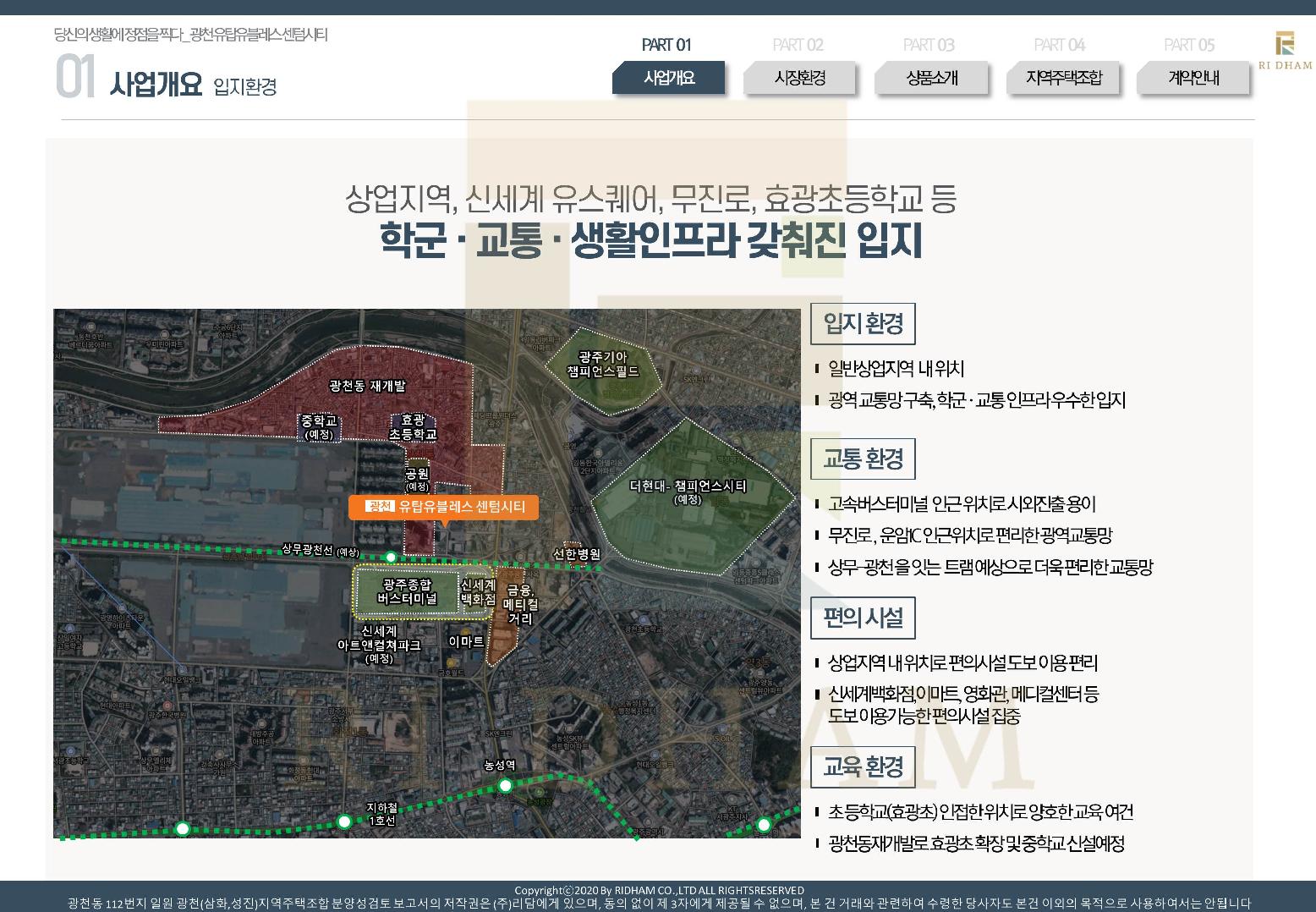 한편, 교육여건에서 효광초교와 중학교(예정)가 도보권 거리에 자리하기에 자녀의 통학에 편리함을 제공하는 학세권으로 분류되고 있으며 상무지구의 인프라와 업무지구의 근접한 위치의 메리트에 의해서 완벽한 생활인프라의 프리미엄을 입주시에 곧바로 누리게 될 것입니다.