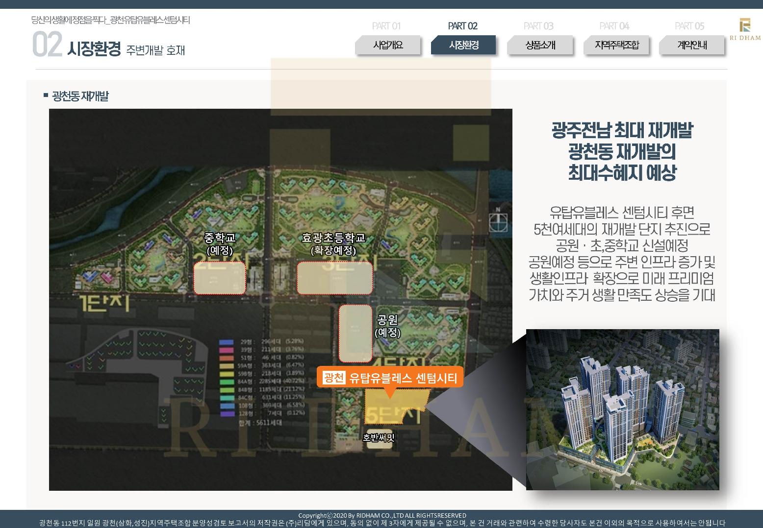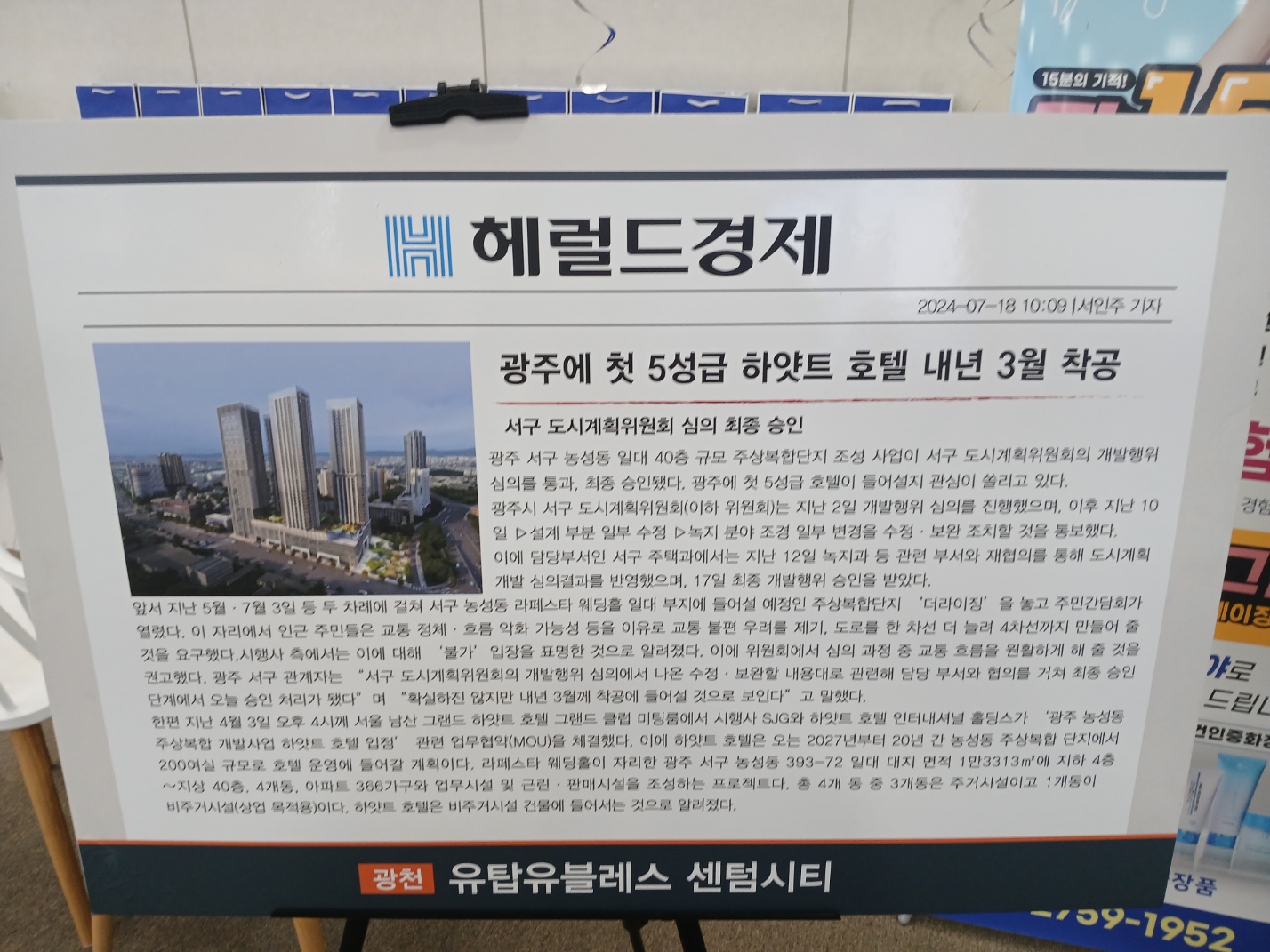 지금 현재에도 유스퀘어 및 터미널이 가까워 편리한 교통에 다양한 문화생활 인프라를 서울과 수도권 수준에서 누리고 있으며, 상징적으로 5성급 호텔이 들어서면서 광천동 지역브랜드와 도시이미지 가치를 더욱 높여주며 공고히할 것으로 기대됩니다.