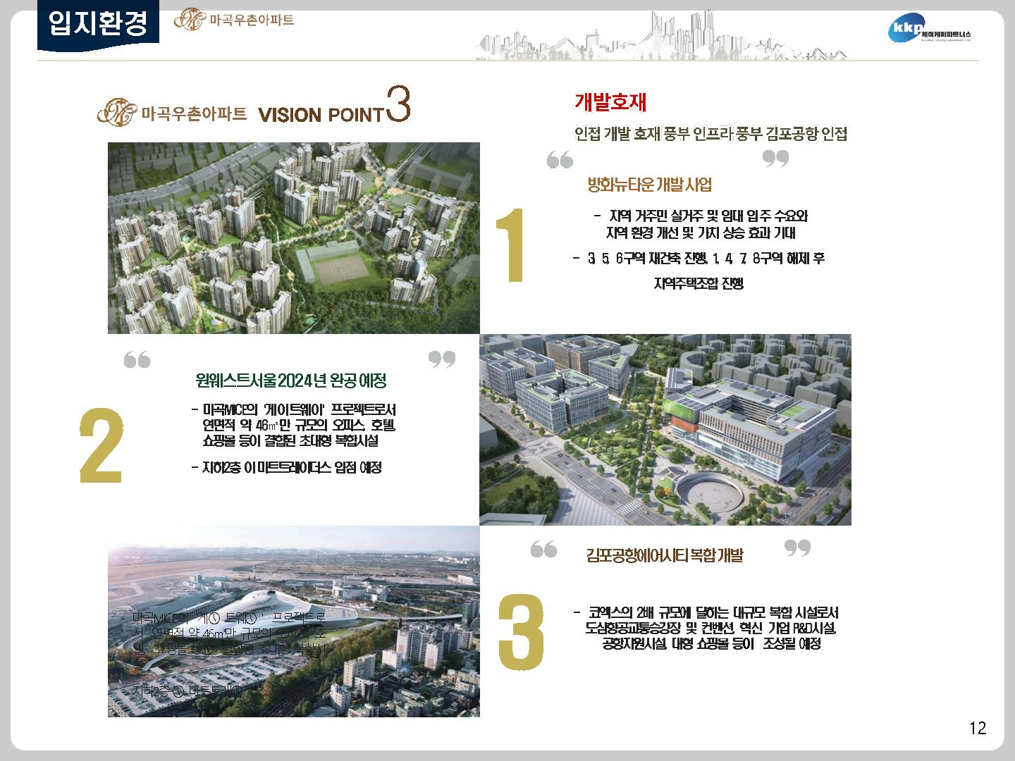 그리고, 지역 내 수요와 공급 환경에서도 방화뉴타운 3, 5, 6 재건축구역이 활발히 진행 중이며, 1, 4, 7, 8 구역의 지역주택조합 개발로 인해 앞으로 이주수요가 상당수 발행하여 자연적인 부동산가치 상승과 아파트가격 및 전세가의 인상이 이어질 것으로 예상되어 실수요자 입장에서는 유비무환의 자세로 마곡우촌아파트와 같은 저렴한 가격의 실속형 주택, 후분양 안전투자 상품에 많은 관심을 기울여 볼 것을 권고드립니다.