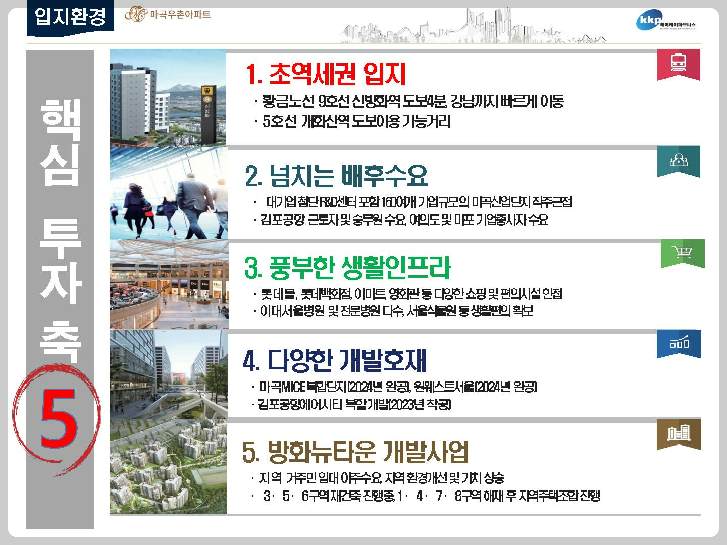 따라서 이러한 발전된 생활환경에 걸어서, 차량 5분 ~ 10분 전후로 마곡의 모든 비즈니스센터를 접근할 수 있다는 것은 우리가 부동산투자에서 교통의 편리함과 주거만족에 이어 투자성과를 이루기 위한 제반요건이 모두 갖춰져 있다고 평가해도 될 것입니다. 그렇기에 실수요자 여러분과 갭투자로 마땅한 투자대상을 찾지 못한 분들에게 이번 마곡우촌아파트는 훌륭한 대안이 되어 줄 것입니다.