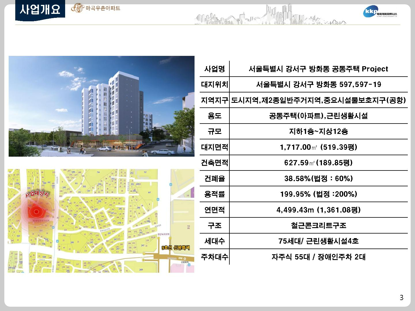 건립위치는 서울 강서구 방화동 597, 597-19번지의 제2종 일반주거지역 용도지역으로 건립규모는 지하 1층 ~ 지상 12층입니다. 사업부지는 대지면적 1717제곱미터 터에 자리 잡고 있으며 연면적은 4499제곱미터의 외형이며 주차대수는 자주식 55대와 장애인 주차 2대를 마련하였습니다. 입주는 준공 후 즉시 가능하며 후분양이기에 안심 안전 내 집마련이 가능한 단지로 분류됩니다.