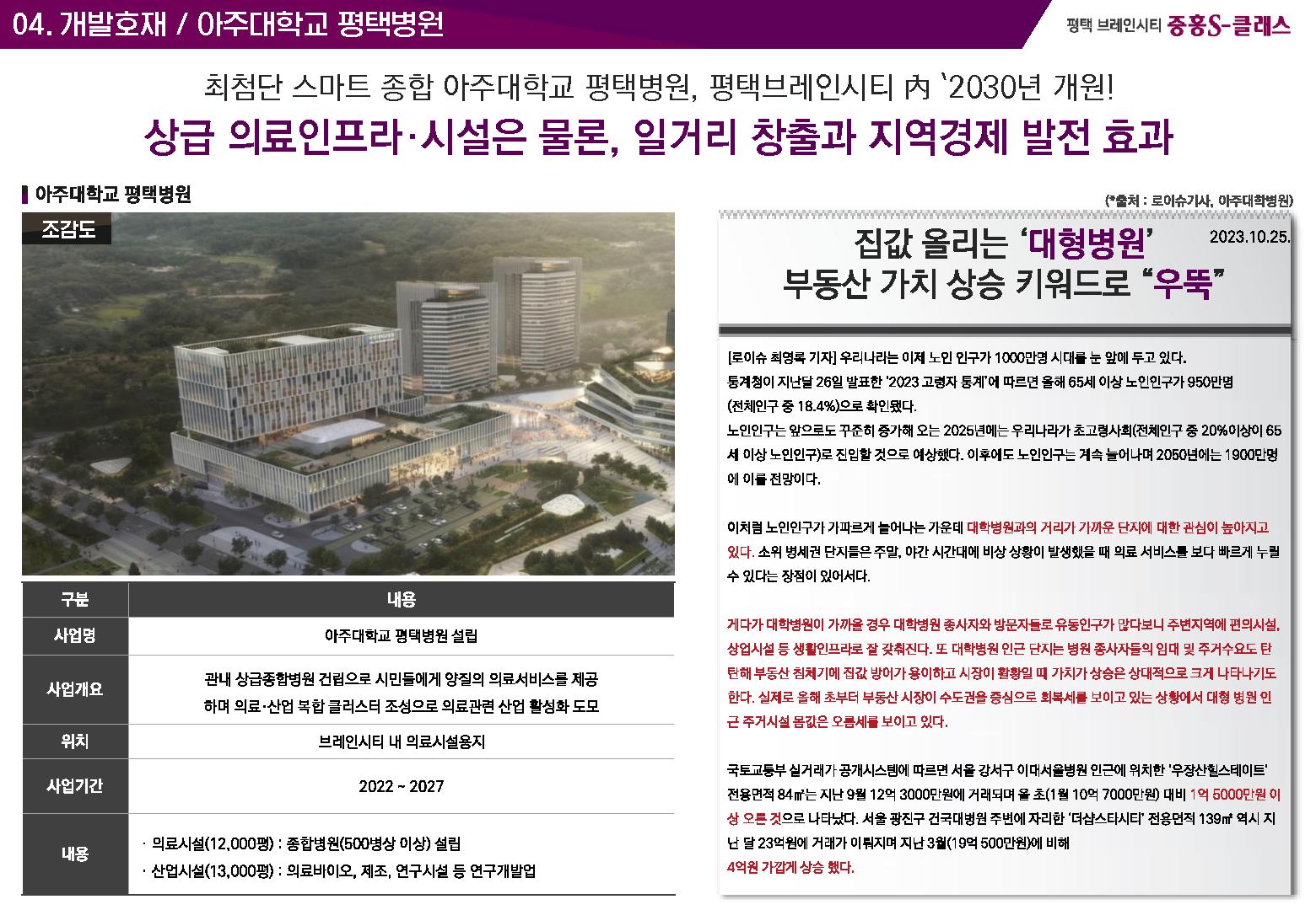 앞서 언급한 아주대종합병원(2024년 착공, 2030년 완공)과 카이스트 펑택캠퍼스와 어우러진 업무시설, 지원시설 등의 대단위 첨단 일자리가 들어서는 복합개발이 특별한 택지지구의 모습입니다.