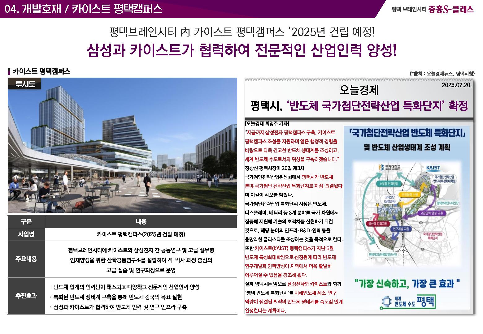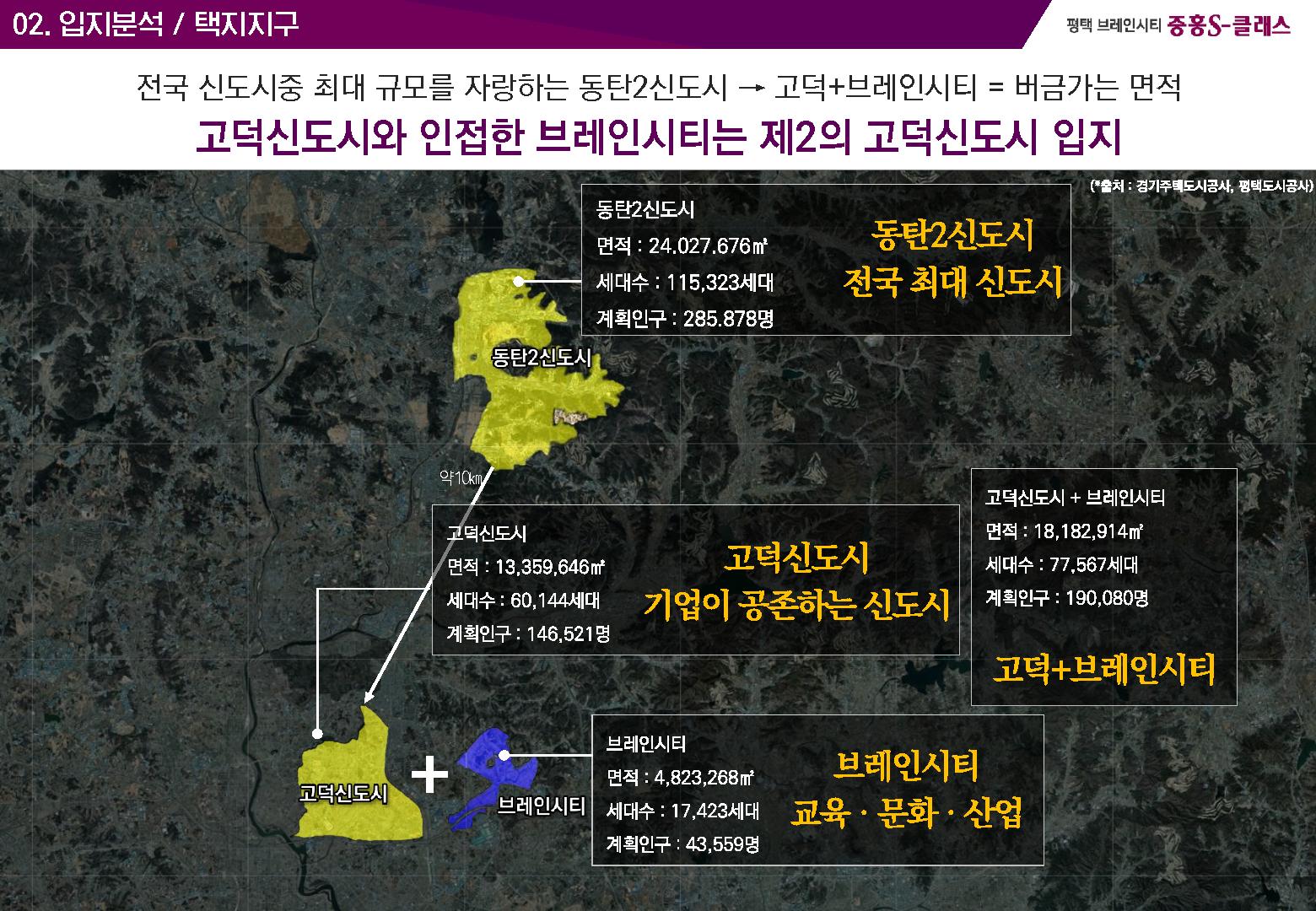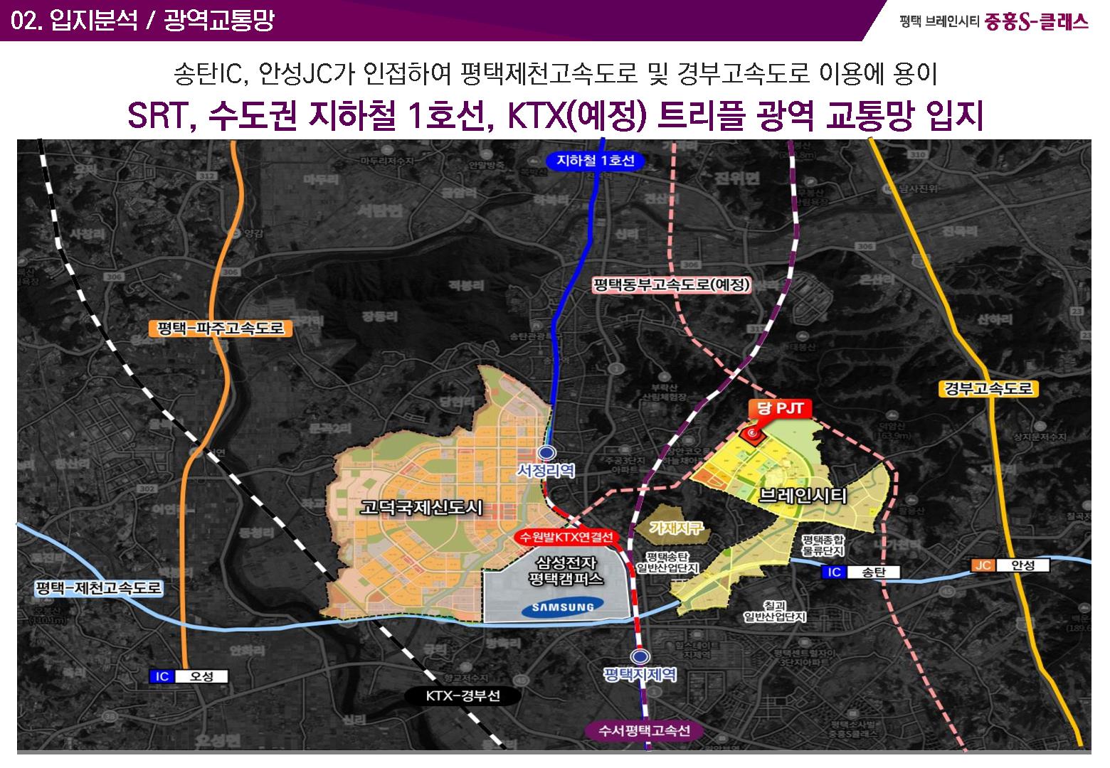 거시적으로 볼 때 평택시 브레인시티 일원은 고덕 삼성전자 4차 반도체 캠퍼스와 차량 10분 이내 접근하는 위치이며 5차~6차 캠퍼스 조성을 본격화하는 활력있는 지역 경제동향의 모습에