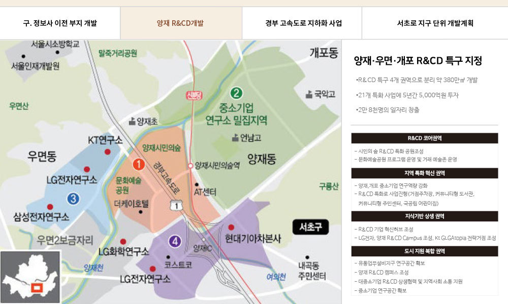 근접한 양재ㅡ우면ㅡ개포 일대에 조성되는 연구개발센터도 주목됩니다. 서초구는 양재 연구개발 특구 사업이 완료되면 글로벌 기업 및 국내 주요 대기업과 이와 연계될 명문대학 연구인력 등 1.5만 여명에 달하는 우수한 일자리가 만들어질 것으로 예상됩니다.