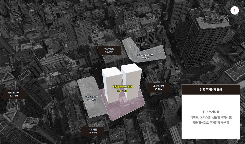 지젤 라이프그라피 서초 오피스텔은 서울 서초구 서초동의 3호선 남부터미널과 가깝고(5분) 추가적으로 유동인구가 풍부한 2호선 교대역의 초역세권과 일반역세권 입지에 터잡고 있는 오피스텔입니다. 서울의 요충지로서 사통팔달 교통망과 우수한 교육환경, 주거 편의성을 지녔다는 것이 가장 큰 장점입니다. 다시 한번 강조드리지만 도보 5분 거리에 서울 지하철 3호선 남부터미널역과 2호선 교대역은 도보 10분, 서초역은 도보 5분 이내로 가까운 트리플 역세권을 지녔습니다.