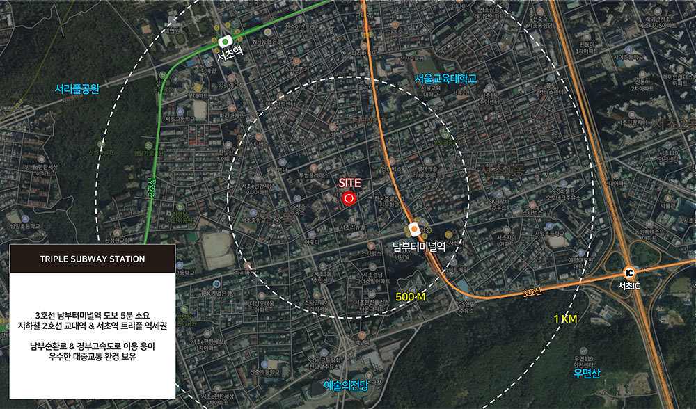 경부고속도로 및 서초나들목, 남부순환로 등의 진입이 쉬운 광역 교통망과 사통팔달의 서울 시내 교통망도 지니고 있으며 개발호재로는 한남나들목 ~ 양재나들목 구간을 대상으로 한 경부고속도로 지하화 사업이 예정되어 있어 몇 년 후 완공 시 상습 교통체증 구간 완화에 이은 주거 환경 개선과 동시에 단절된 강남~서초의 연결로 부동산가치의 상승이 탄력받게 될 것으로 기대됩니다