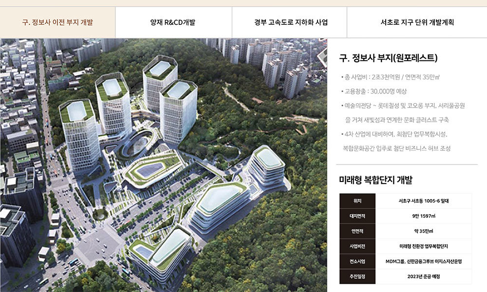 서초구 일대에 옛 정보사 부지가 친환경 문화예술 복합타운으로 개발이 확정된 사안으로 착공만을 앞두고 있습니다. 서초구 일원에서는 보기 힘든 사업으로 이 또한 지역경제와 서초의 발전을 더욱 높여줄 것입니다. 사업의 외형은 부지면적이 축구장 13개와 맞먹는 크기인 9만6795㎡ 규모로 조성되는 스케일이며 대부분 수준 높은 일자리가 들어서면서 종사자 약 3만여 명의 고용 창출 효과가 예상되며 예술의전당, 롯데칠성 및 코오롱 부지, 서리풀공원 등을 거쳐 새빛섬과 연계한 문화클러스터 구축 효과도 나타날 전망이기에 서초의 발전은 점차 국내 최고 수준의 정주환경을 지니게 될 것입니다.