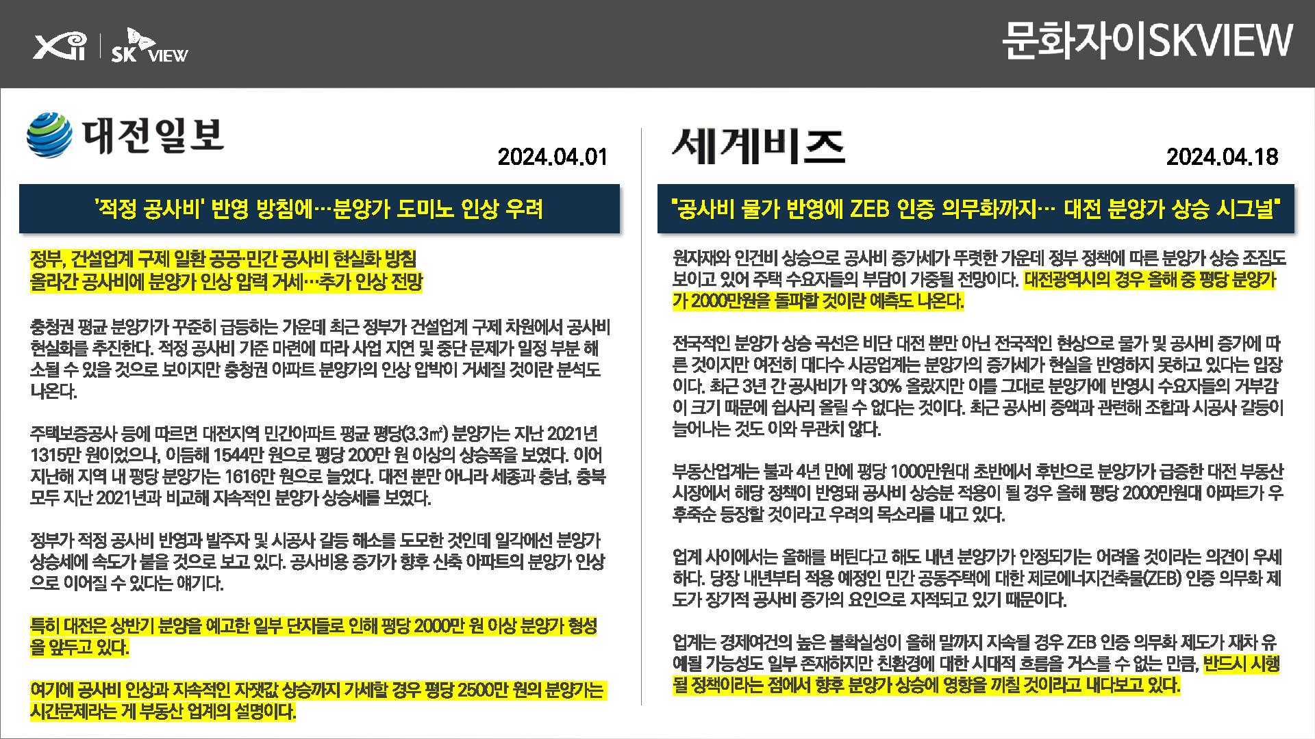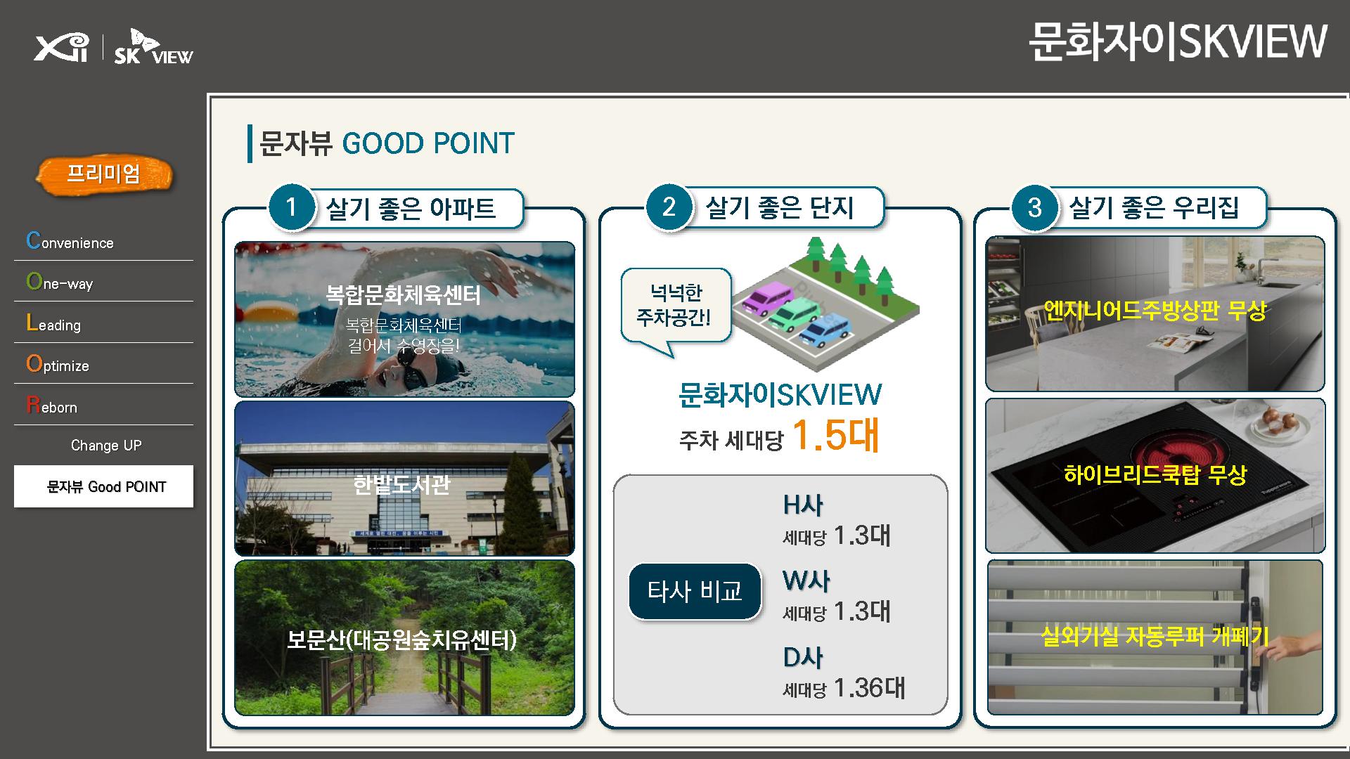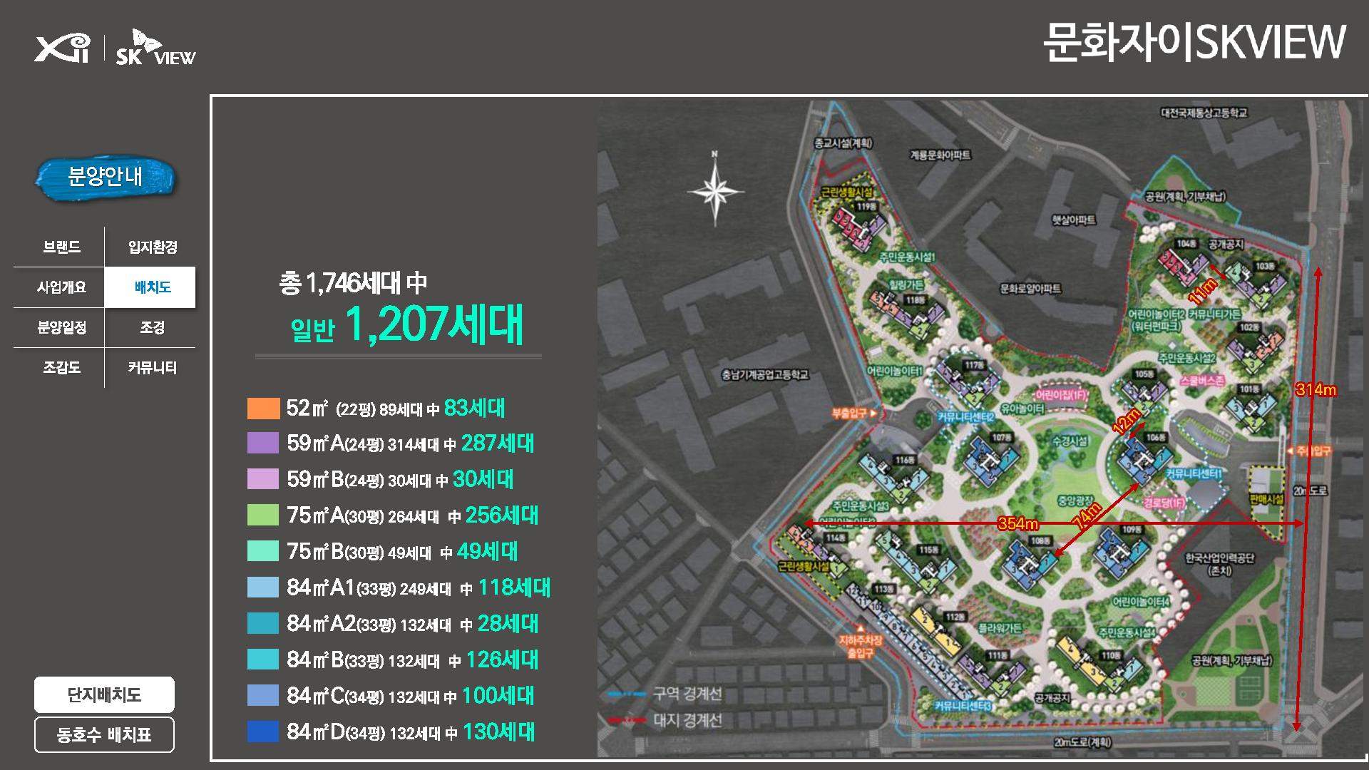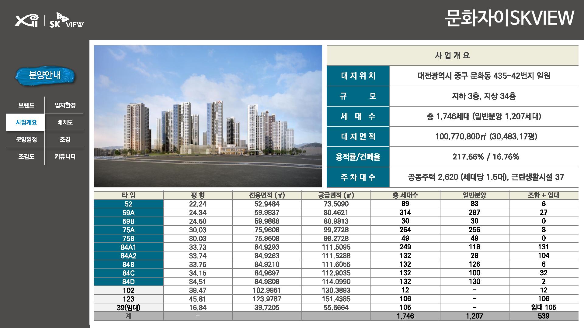 한편, 문화자이SKVIEW 아파트는 건립위치가 대전 중구 문화동 435-42번지 일원으로 그 규모는 지하 3층 ~ 지상 34층으로 총 1748세대로 건립 중이며 대지면적 30,483평의 부지에 낮은 용적률 217.66%를 적용하고 건폐율 16.76%로 쾌적한 단지조경과 넓은 동간격을 설계하게 됩니다. 그리고 주차대수는 지역 내에서도 압도적인 1.5대 면으로 총 2620대를 설계하여 쾌적한 주차환경을 선보일 것입니다.