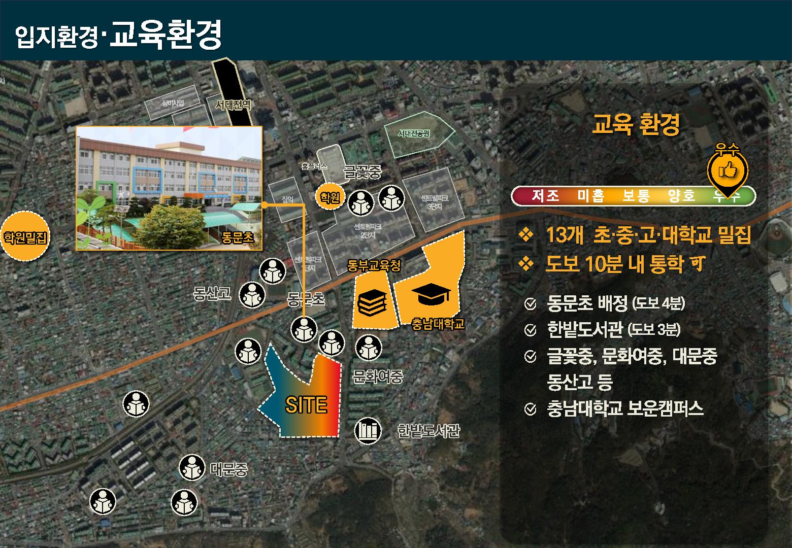무엇보다 이 아파트 건립지 일원은 교육환경에서 뛰어난 안정감을 갖추고 있습니다. 가장 먼저 초등학교는 동문초등학교가 가깝게 위치하여 배정될 것이며, 글꽃중과 문화여중, 대전중동신고교 또한 근거리에 위치하며 충남대학교 보문캠퍼스와 한밭도서관이 근접하여 면학분위기가 우수한 곳입니다.