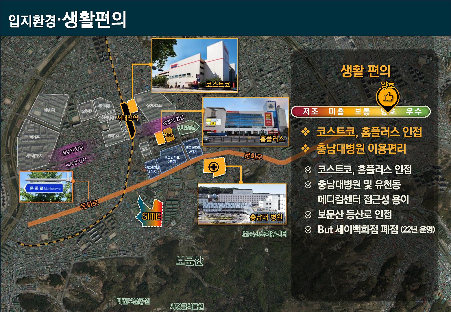 더불어 홈플러스와 코스트코대형할인마트가 인접하면서 충남대병원과 유천동메디컬센터가 가까워 의료지원환경이 우수한 곳이면서 보문산 등산로와도 가까워 일상생활의 편의와 쾌적함을 두루 갖춘 곳으로 평가됩니다.