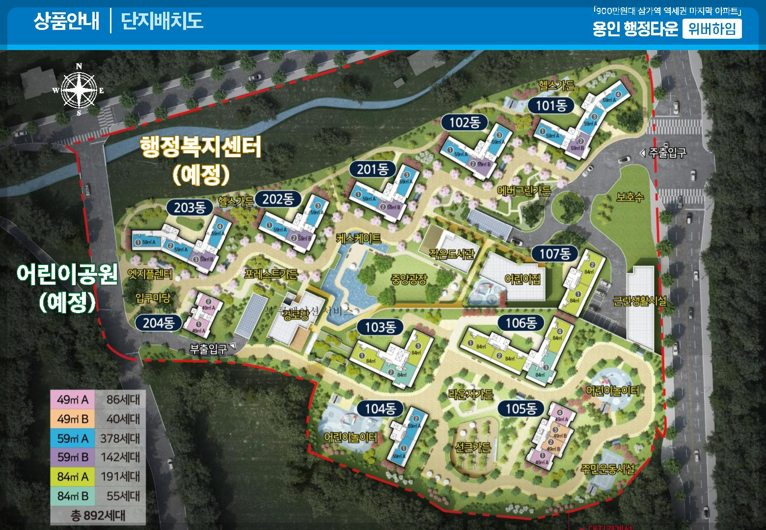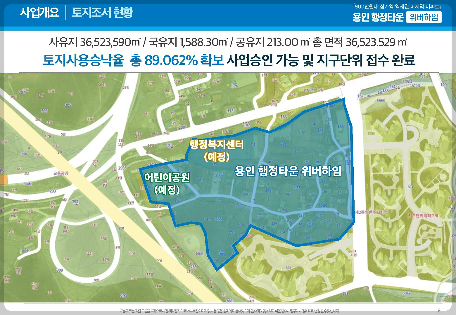 건립지 위치는 용인시 처인구 삼가동 298-3번지 일원으로 현재의 제1종 일반주거지역에서 제2종 일반주거지역으로 종상향을 예정하는 입지로 대지면적 36,523제곱미터 부지에 연면적 120,751제곱미터의 외형으로 그 규모는 지하 2층에서 지상 29층 총 11개 동 892세대(예정)를 건립하는 공동주택 건립사업이며 건폐율은 10.75%이기에 단지 자체가 공원과 같이 조성이 될 것으로 기대되며, 주차대수는 세대당 1.76대 몫 1,248대를 설계하게 되며, 건립평형대는 49 타입과 59 타입, 84 타입의 선호도 높은 국민주택평형 위주의 중소형 아파트로 건립할 예정입니다.