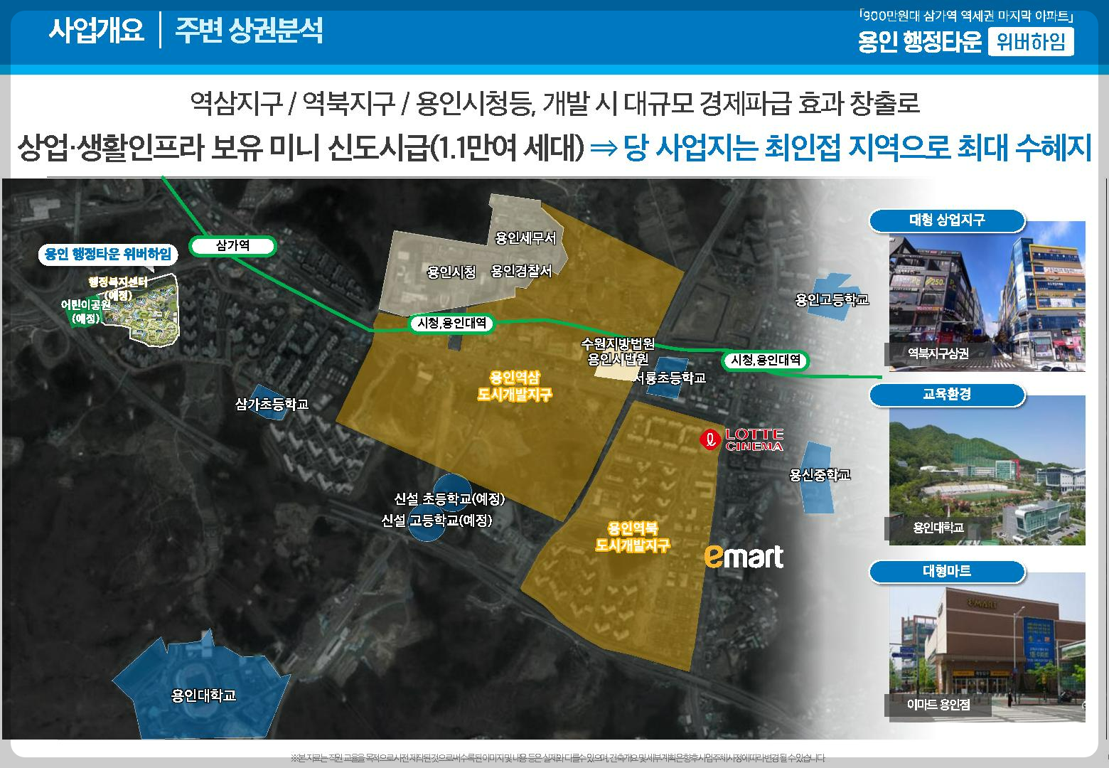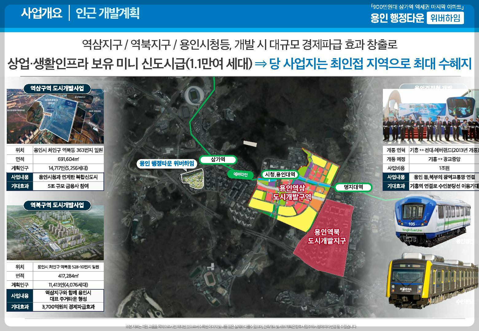 사업 대상지 일원은 용인시청과 처인구청이 이웃하면서 100만 인구를 넘어선 용인시 행정타운 중심권에 터 잡고 있습니다. 또, 갈수록 노령인구 건강관리에 중요함이 부각되는 우리 일상에서 중요한 대형종합병원이 근접한 거리에는 용인세브란스 종합병원이 근처에 자리하며, 이미 활발한 기업활동을 유지하는 지곡산업단지 및 용인시 주요 업무시설과도 가까이 자리하기에 직주근접의 면모를 탄탄히 갖추고 지녔습니다.