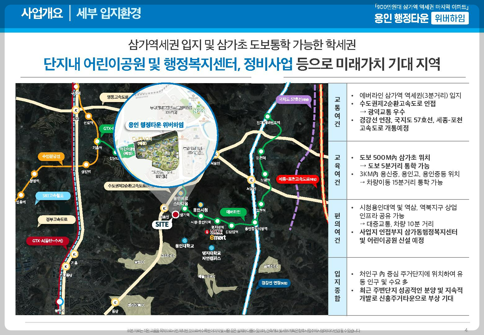 입지환경에서 가장 주목되는 용인 행정타운 위버하임 아파트의 장점은 경전철(에버라인) 삼가역이 도보 약 3분 약 250미터의 역세권이면서 제2외곽순환도로 서용인 I.C와도 차량 7분의 양호한 교통여건과 서울~세종고속도로 임박의 수혜를 갖추고 있는 점입니다.