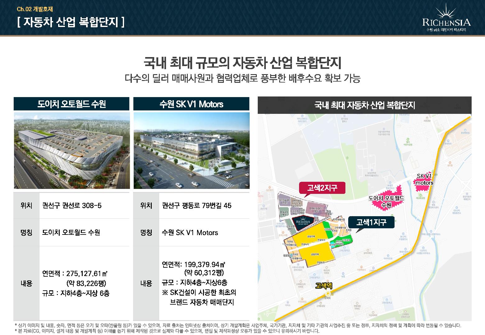 또 하나 주목되는 일자리 부분은 도치치 오토월드 수원, 수원 sk v1 모터스가 중심이 된 국내 최대 자동차 산업 복합단지 조성으로 서울과 수도권의 2200만 인구를 대상으로 한 거대한 배후수요로 관련 종사의 훌륭한 주거공간의 한 곳이 바로 고색지구 일원이 될 것이며 수원 금호 리첸시아는 주거형오피스텔 중에서 아파텔로 아파트와 오피스텔의 장점을 결합한 설계와 평면, 주차시스템 등의 완비로 아파트 대체시설의 가치를 지니고 있기에 투자 선택에서 주거와 재테크 2가지 만족을 누리게 될 것입니다.