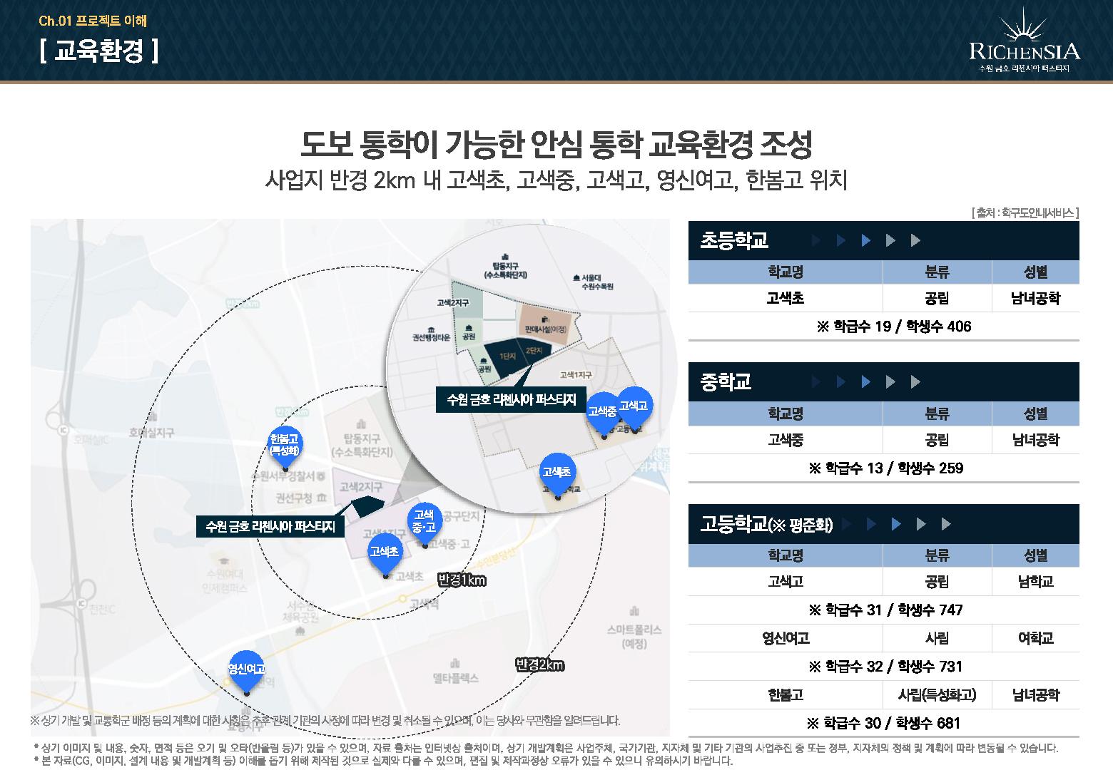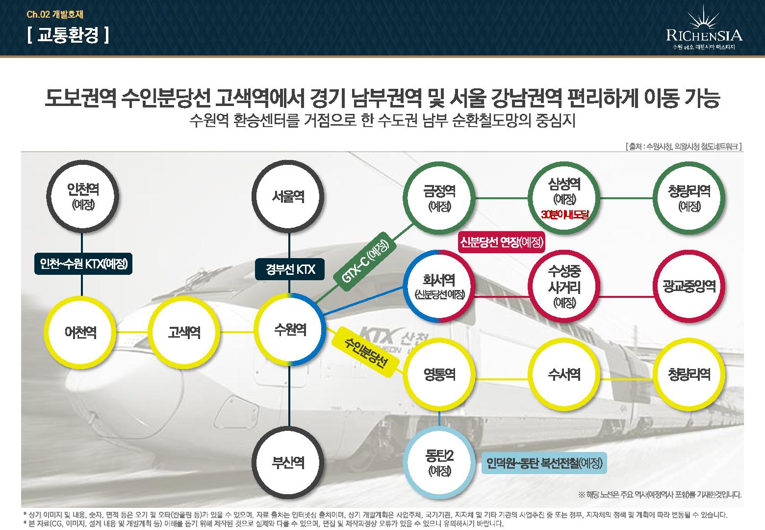 한편, 수원 금호 리첸시아 퍼스티지가 소재한 고색2지구 일원은 서수원의 신흥 랜드마크 주거단지로 조성되며 덕산병원 착공과 판매시설 용지 공급 예정으로 전체 4.7만평의 효율적인 개발이 이뤄지고 있으며 고색1지구 개발과 함께 수원역 이용이 더욱 편리한 입지적 장점을 지녔습니다.