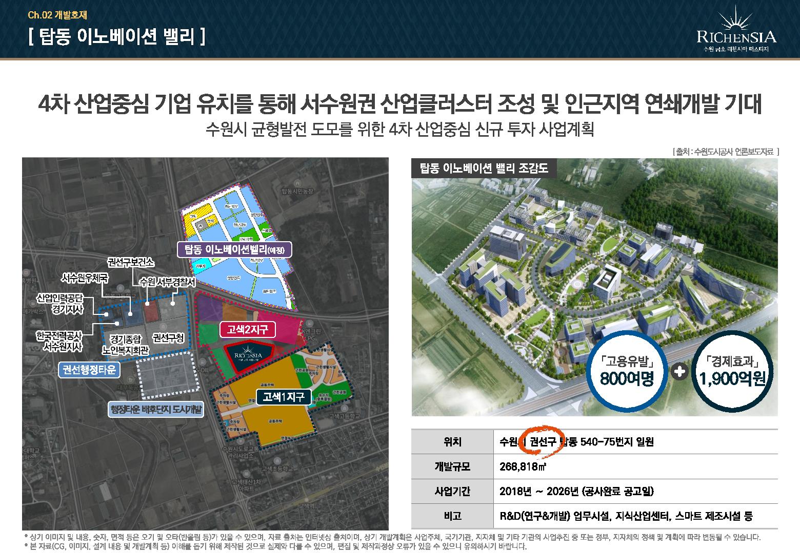 이와 더불어 인접한 탑동지구의 개발은 4차 산업 중심의 기업 유치를 목표로 서수원권 산업클러스터 조성과 인근지역 연쇄개발을 기대하며 다소 부족한 서수원의 고급일자리 확충과 수원시 균형발전 도모의 정책목표를 이뤄내면서 서수원 고색2지구 수원 금호 리첸시아 투자의 비전을 이끌어 줄 또 하나의 호재로 평가됩니다.