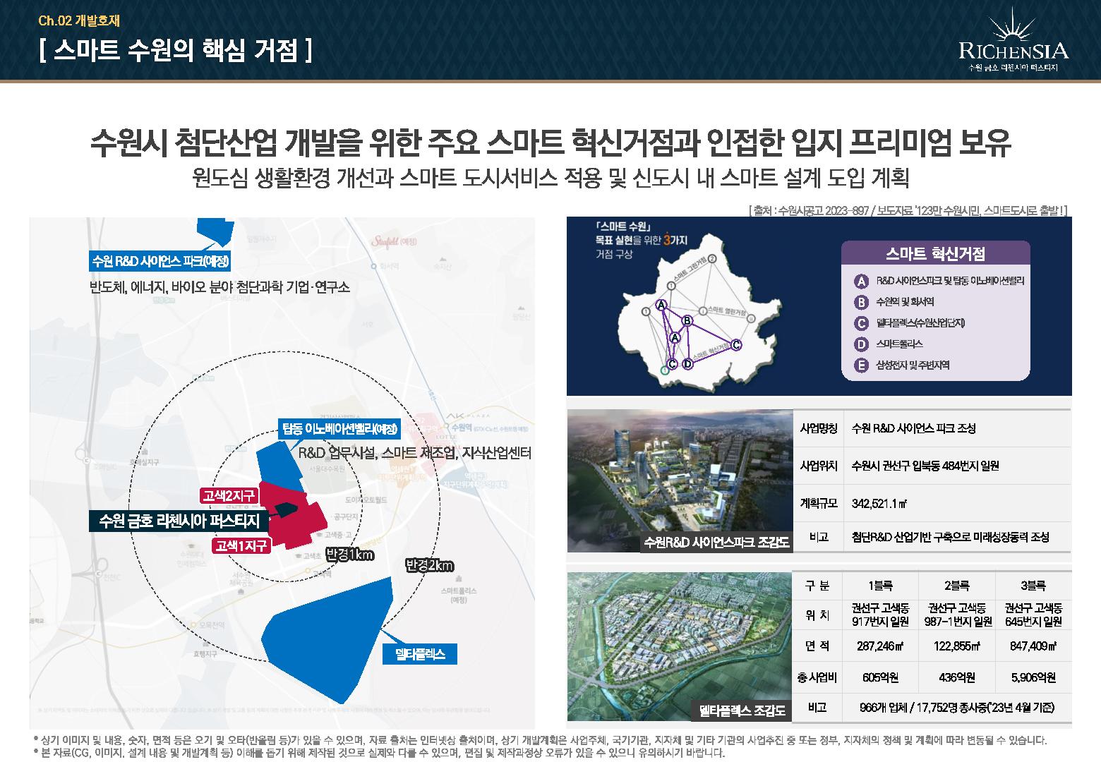 그리고, 수원시 첨단산업 개발을 위한 주요 스마트 혁신거점과 인접한 입지 프리미엄도 추가로 갖추고 있으며 원도심 생활환경 개선과 신도시 내 스마트 설계시스템 도입 적용을 계획하며 이를 마무리하는데 주요한 역할을 하게 될 것입니다.
