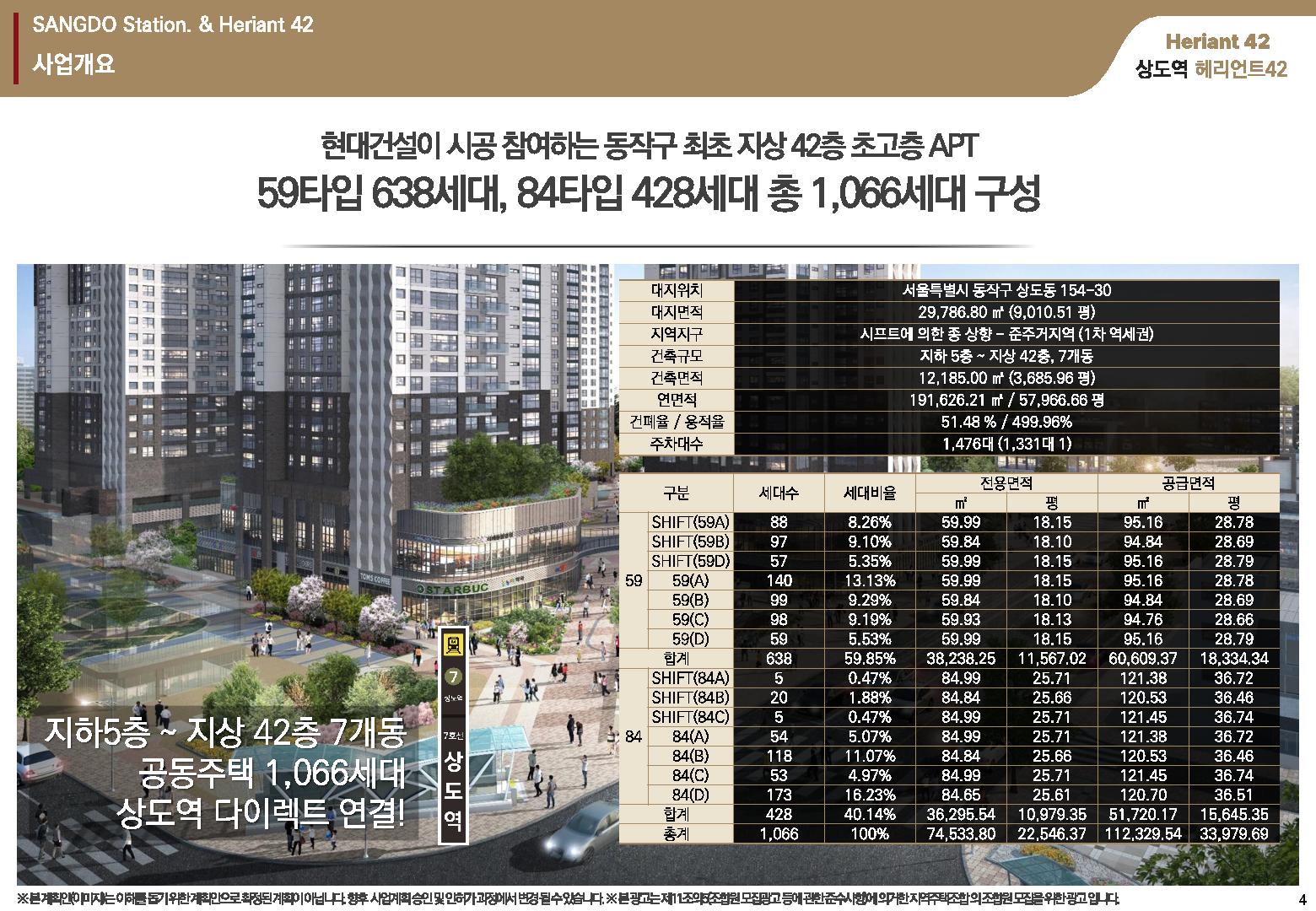 그 규모는 지하 5층 ~ 지상 42층, 총 7개 동, 1,066세대 건립을 예정으로 건립평형대는 59 타입 638세대와 84 타입 428세대로 구성되며 주차대수는 1,476세대를 설계할 예정입니다.