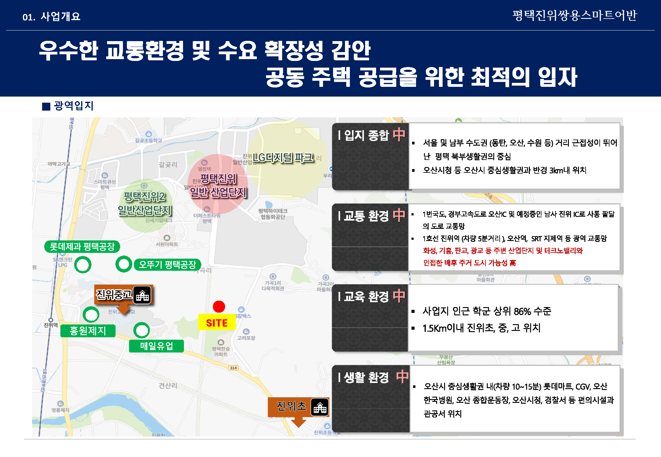 당 사업지 일원은 서울시 남단의 수도권 지역으로 가까이는 오산시와 동탄 2 신도시, 수원특례시와 근접한 위치로 평택시 일원에서는 조금 더 서울과 수원권역으로 이동하기 수월한 교통여건이 마련되어 있습니다.
