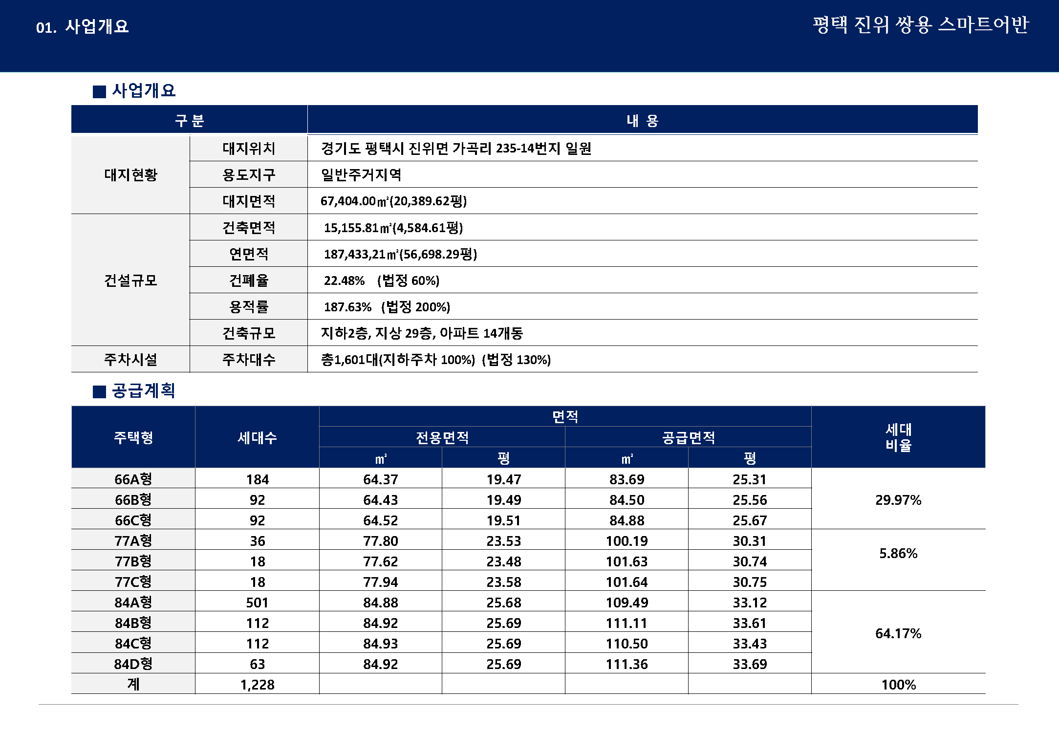 총 1,228세대의 84제곱미터 이하 전용면적의 중소형 아파트 위주로 건립평형 또한, 77제곱미터 ~ 구 30평형 A, B, C타입 3가지와 국민평형 84M2 A, B, C, D 4가지 등 총 7가지로 구성되어 실수요자들이 가장 선호하는 주택형으로 건립될 예정입니다. 세부적인 건립위치는 가곡 2 지구 도시개발구역 내에 소재한 경기도 평택시 진위면 가곡리 141-1번지 일원이며, 몇년 전 유행했던 어수선하고 사업일정이 구체화되지 않은 일부 지역주택조합 사업 현장보다 안정된 보금자리 마련의 수단으로 주목됩니다.