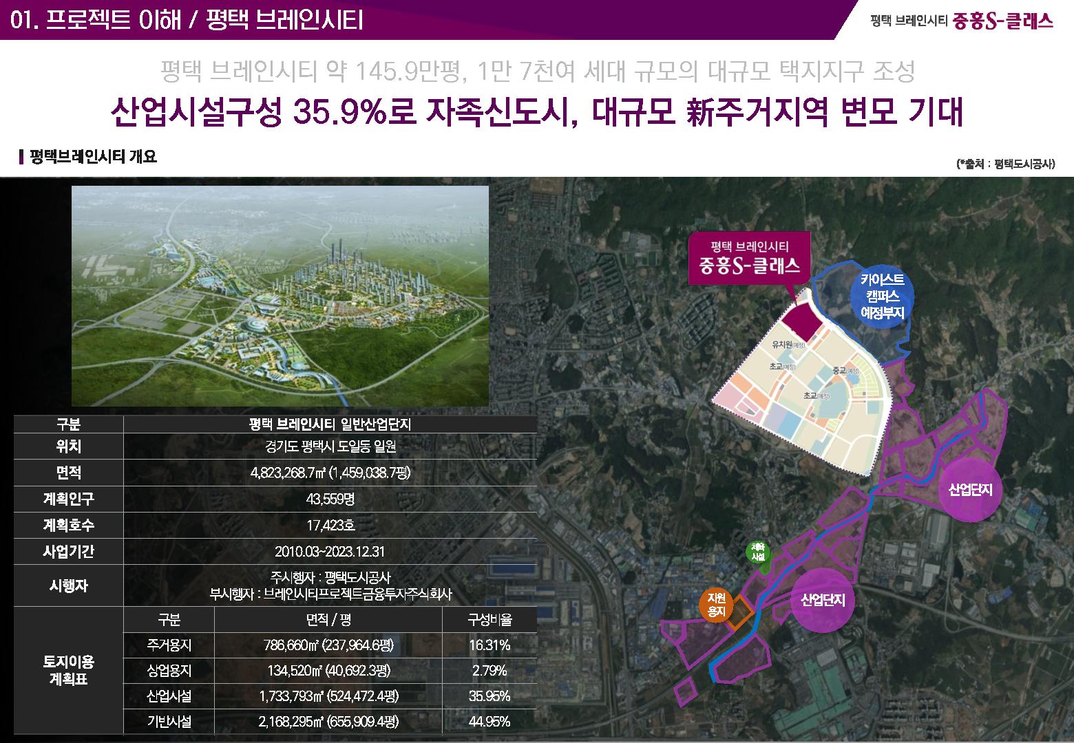 또한, 투자 목적의 접근에서도 입주 전 전매가 가능한 수도권 남단 평택의 주요 택지지구 브레인시티의 핵심 위치에 터잡는 이곳은 고덕 삼성전자 반도체 캠퍼스 단지와 직주근접 생활권으로 브레인시티에 자리하게 될 산학협력 관련 기관, 의료타운과 주거시설, 상업시설이 복합적으로 들어서는