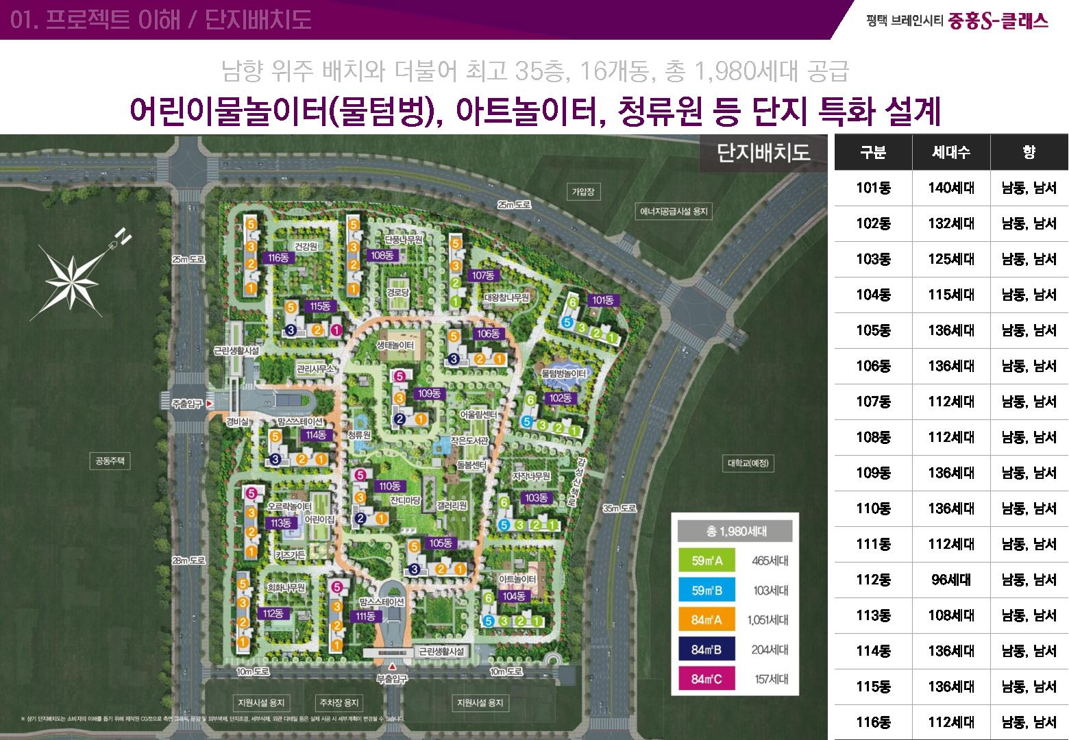 단지 구성은 전반적으로 남향 위주 단지배치에 최고 35층의 탁트인 개방감이 장점이며 단지 내 곳곳에는 어린이물놀이터(물텀벙)와 아트놀이터, 청류원 등 어린이들이 외부에서 활동하지 않아도 될 공간과 청류원 등 정서정 안정과 휴식을 취할 공간이 평택 내에서도 최상위 수준으로 마련됩니다.