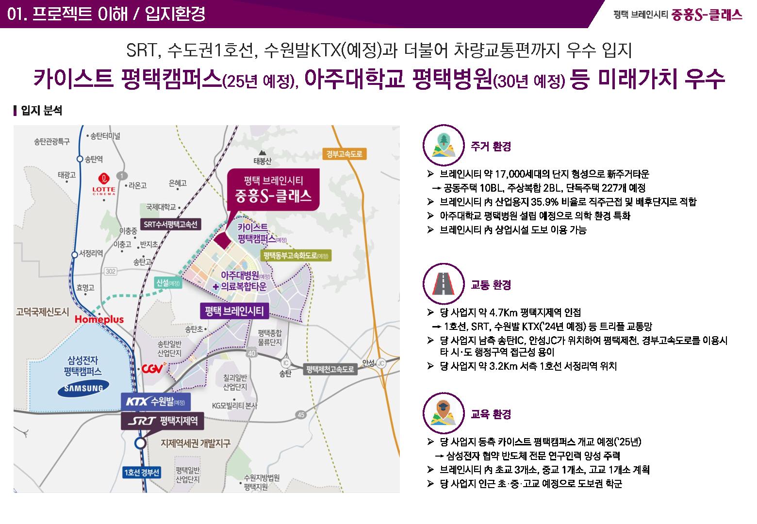 가장 먼저, 세계적인 연구개발 대학인 카이스트 평택캠퍼스와 아주대종합병원 의료복합타운이 들어서는 평택 택지지구 브레인시티 복합개발택지지구에서도 첫자리인 B1블록 위치에 건립중인 상징성으로 분양 초기에 여러 제반 사정으로 완판을 이뤄내지는 못했지만,