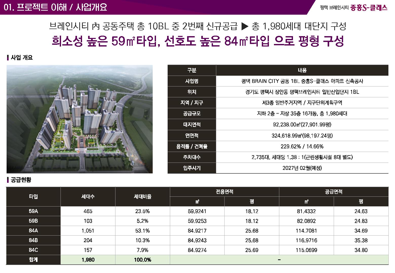 건립위치의 행정구역은 경기도 평택시 장안동 평택브레인시티 일반산업단지 1블록입니다. 무엇보다 젊은 수요층이 가장 많이 선택하는 중소형 아파트 위주로 희소가치 높은 59㎡타입(구.25평형)과 국민평형으로 소비자 선호도가 높은 84㎡(구.33평형)으로만 구성된 총 1,980세대 대단지로 분류되며, 분당이나 여의도에서처럼 일종의 시범단지와 유사하게 브레인시티 내 공동주택 중에서도 초기에 신규공급하고 있습니다.