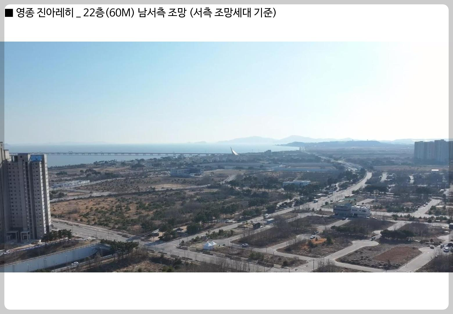 또 하나 이 아파트의 장점은 영종에서도 단연코 앞서는 조망권(일부 세대)입니다. 주변의 단지 배치 높은 지대에 위치하여 남동향 남서향 배치의 남향 위주의 아파트로 바다조망이 뛰어난 곳으로 기존 영종국제도시 단지에서도 바다 조망 여부는 그렇지 않은 비조망 세대보다 수천만 원 이상의 프리미엄이 높게 형성되어 있는 점으로 영종 진아레히의 거주 장점이자 투자 메리트로 평가됩니다.