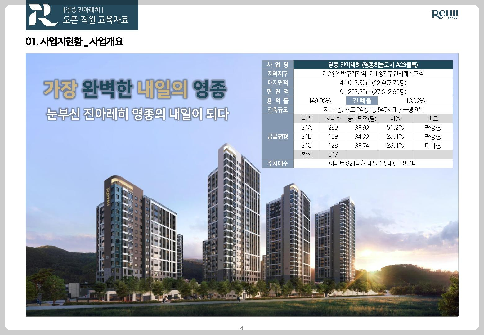 세대수는 총 547세대를 모든 평형대가 전용면적 84제곱미터로 판상형 84A타입 280세대 구) 33평형, 84B타입 139세대 구) 33평형을 중심으로 타워형 84C타입 128세대를 구성하여 영종국제도시에 그동안 공급된 아파트 위주의 단지 중에서 가장 압도적인 세대당 1.5대 몫으로 총 821대를 마련함으로 실질적인 세대당 2대 주차가 가능한 주차공간의 주거편의가 마련된 아파트단지입니다.